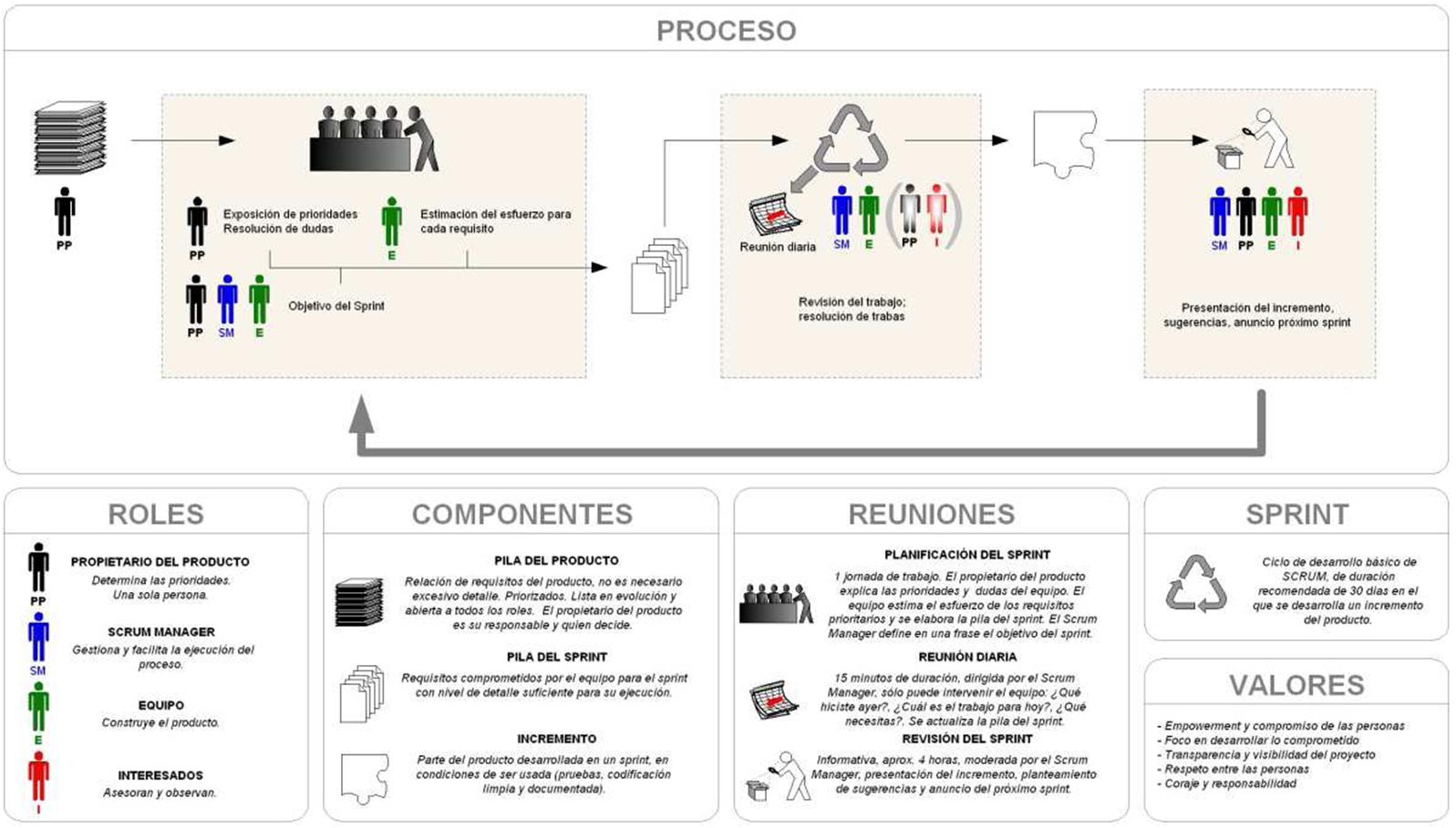 · Roles: Propietario del producto, Gestor o Manager del Scrum, Equipo e Interesados.